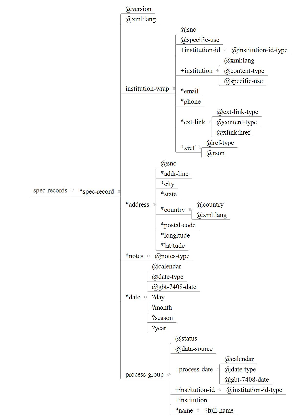 机构规范元数据包括机构信息描述和操作信息描述,复用统一文献元数据标准中的机构信息(institution-wrap)、地址(address)、注释(notes)、日期(date)和操作信息(process-group)。如图1所示。